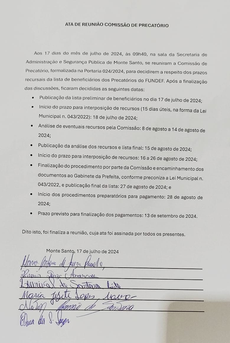 Durante a assembleia de hoje, a prefeita publicou a lista de beneficiários dos precatórios do FUNDEF no Diário Oficial, conforme prometido. A publicação ocorreu no dia 17 de julho de 2024, marcando um avanço significativo nas negociações. A Comissão de Precatórios também divulgou um cronograma detalhado com as próximas etapas, incluindo o prazo para interposição de recursos, análise de recursos, e a previsão para o início dos pagamentos, que deve ocorrer até o dia 13 de setembro de 2024.