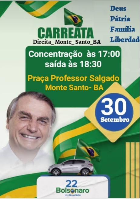 Em Monte Santo, o Grupo Direita_Monte_Santo-BA está organizando a carreata para a próxima Sexta-Feira dia 30 de setembro com concentração a partir das 17h na Praça Professor Salgado.