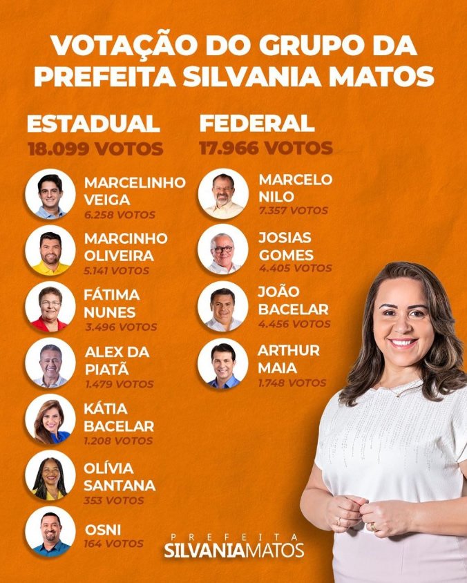 Este ano, de forma estratégica, a Prefeita dividiu cada Região e Povoados do Município e definiu o apoio aos políticos de cada localidade. Assim, além de Marcelo Nilo e Marcelinho Veiga, Silvania Matos também apoiou vários outros Candidatos e divulgou, nesta segunda-feira (03/10), um Card que mostra que obteve mais de 18 mil votos, dados aos Candidatos que foram apoiados pelo seu Grupo Político. confira: