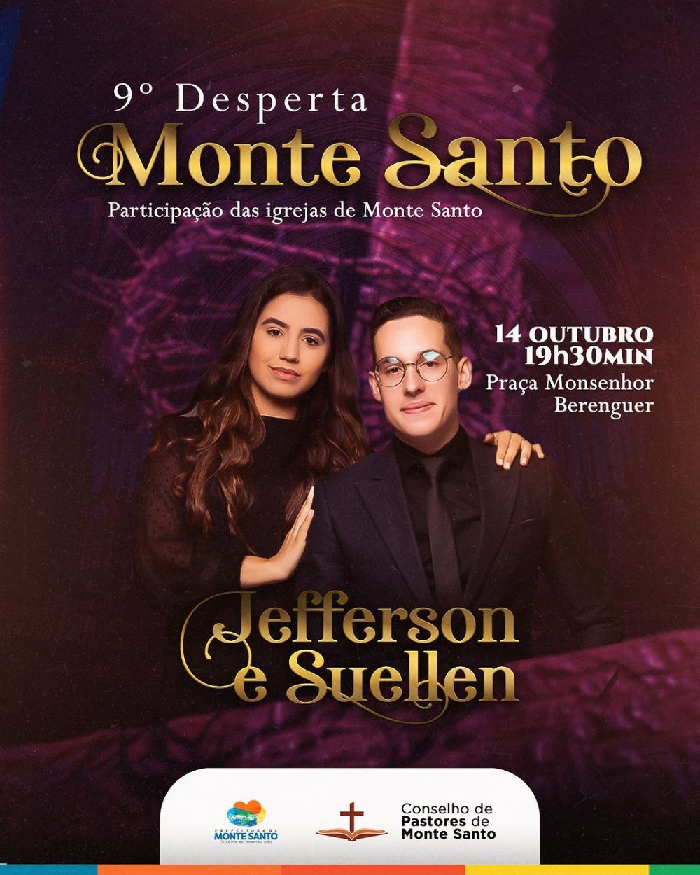 A festa contará com apresentação da dupla gospel de grande sucesso: Jefferson e Suellen, e será realizado no sábado dia 14/Outubro a partir das 19:30h, na praça Monsenhor Berenguer, venha receber suas bênçãos e louvar o nome de Deus.