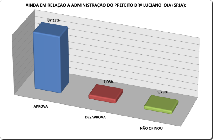 O levantamento também mediu a avaliação dos entrevistados sobre a gestão no local. 8,41% consideram o governo ótimo e 72,57% boa. Outros 10,18% acham o trabalho regular, 1,77% péssimo e 3,54% não opinaram.