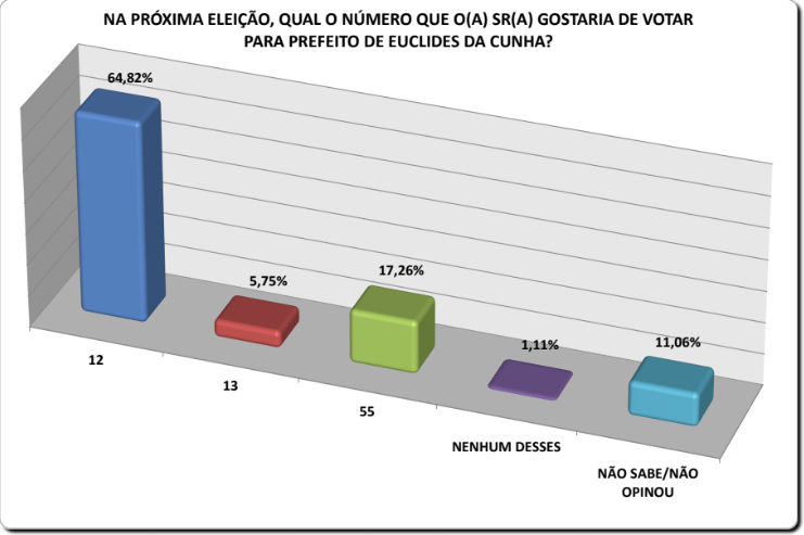 Já sobre a escolha de representantes dos partidos mais bem votados no local. O 12, número para voto do PDT, lidera com favoritismo disparado aos 64,82%, seguido do 55, do PSD, com 17,26% e o 13, do PT, com 5,75%. Na pesquisa, 1,11% decidiram que nenhuma das siglas é uma opção de escolha e 11,06% se absteve de opinar.