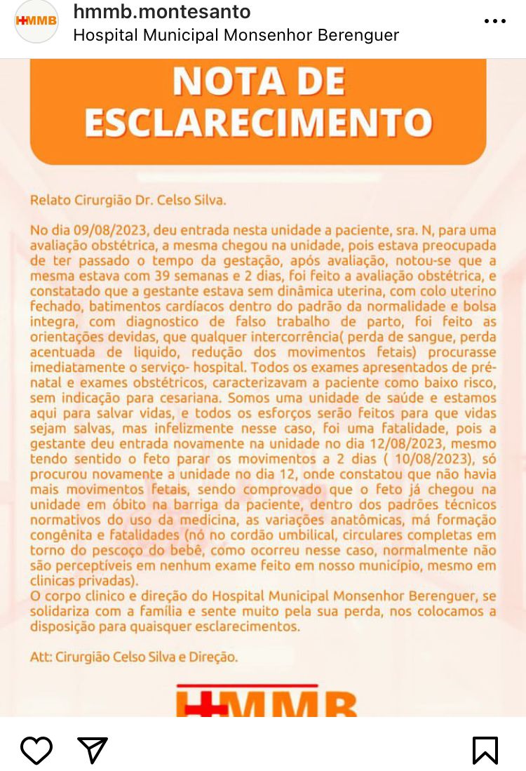 O caso ganhou muita repercussão e revolta da população que cobrava diariamente por uma resposta da atual gestão e após 5 dias de silêncio o Hospital Municipal Monsenhor Berenguer finalmente resolveu se pronunciar sobre o caso e se limitou a publicar a seguinte NOTA DE ESCLARECIMENTO: